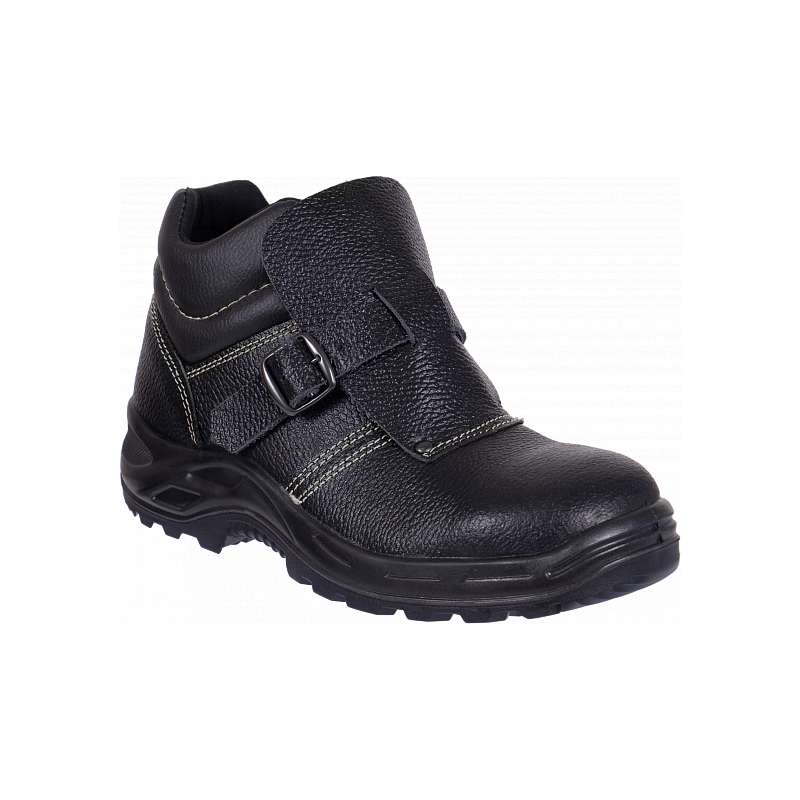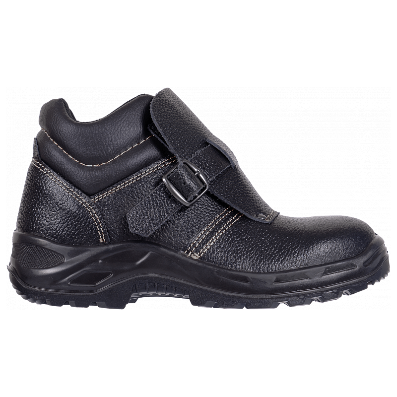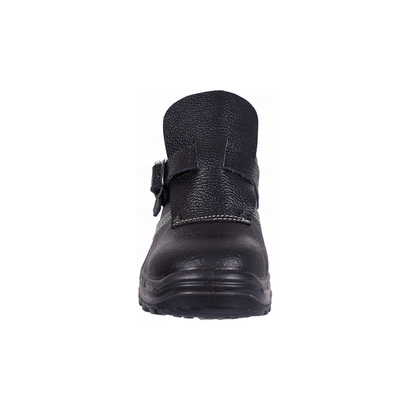 Глухой клапан и дополнительная кожаная накладка с металлической пряжкой закрывают шнуровку и предотвращают попадание окалины и брызг металла внутрь обуви. Используются термостойкие нити и металлическая фурнитура.